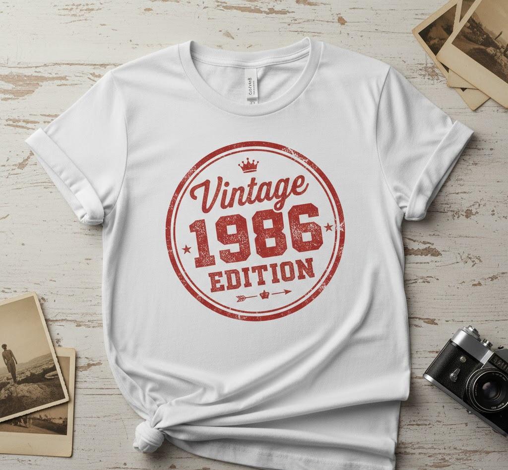 A 1986 “Vintage Edition” t-shirt is a good choice to remember your birth year in a vintage look. These types of ideas are based on old designs, rough fonts, and faded colours. Works very well for an authentic vintage look.