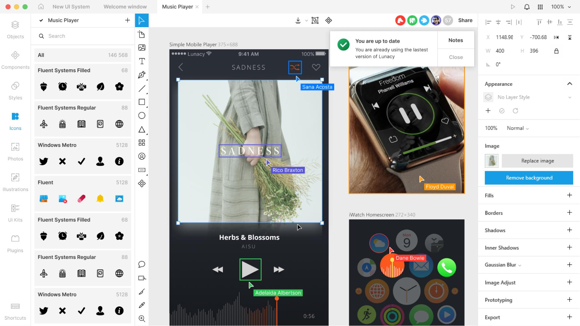 Lunacy incorporates extensive design resources directly within the application environment, sourced from Icons8’s content library: