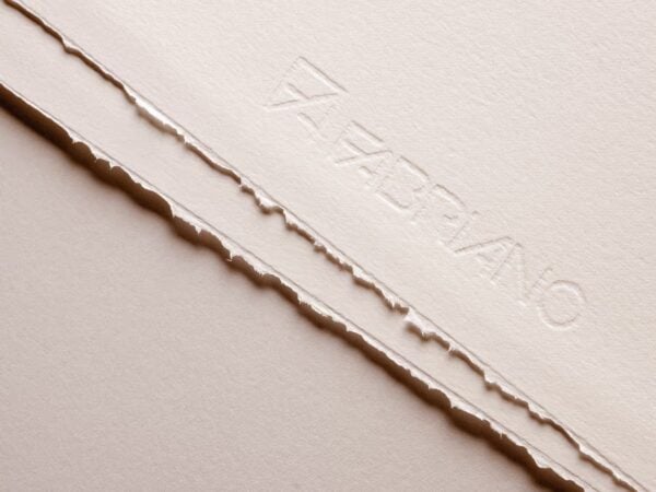 - Type: This paper features a unique cotton composition, enhanced with watermarked detailing and two deckled edges. The watermark runs parallel to the two larger sides of the sheet, reproducing the Fabriano trademark and logo, a mark of quality and authenticity.