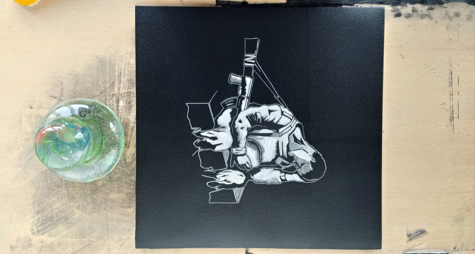 Monsters From The ID” is an evocative design in progress, aiming to depict the intricacies of PTSD. The finished artwork will feature a soldier with blood surrounding his feet, and ghostly hands reaching out towards him. These haunting images represent the unseen horrors that linger in his mind, visible only to him.