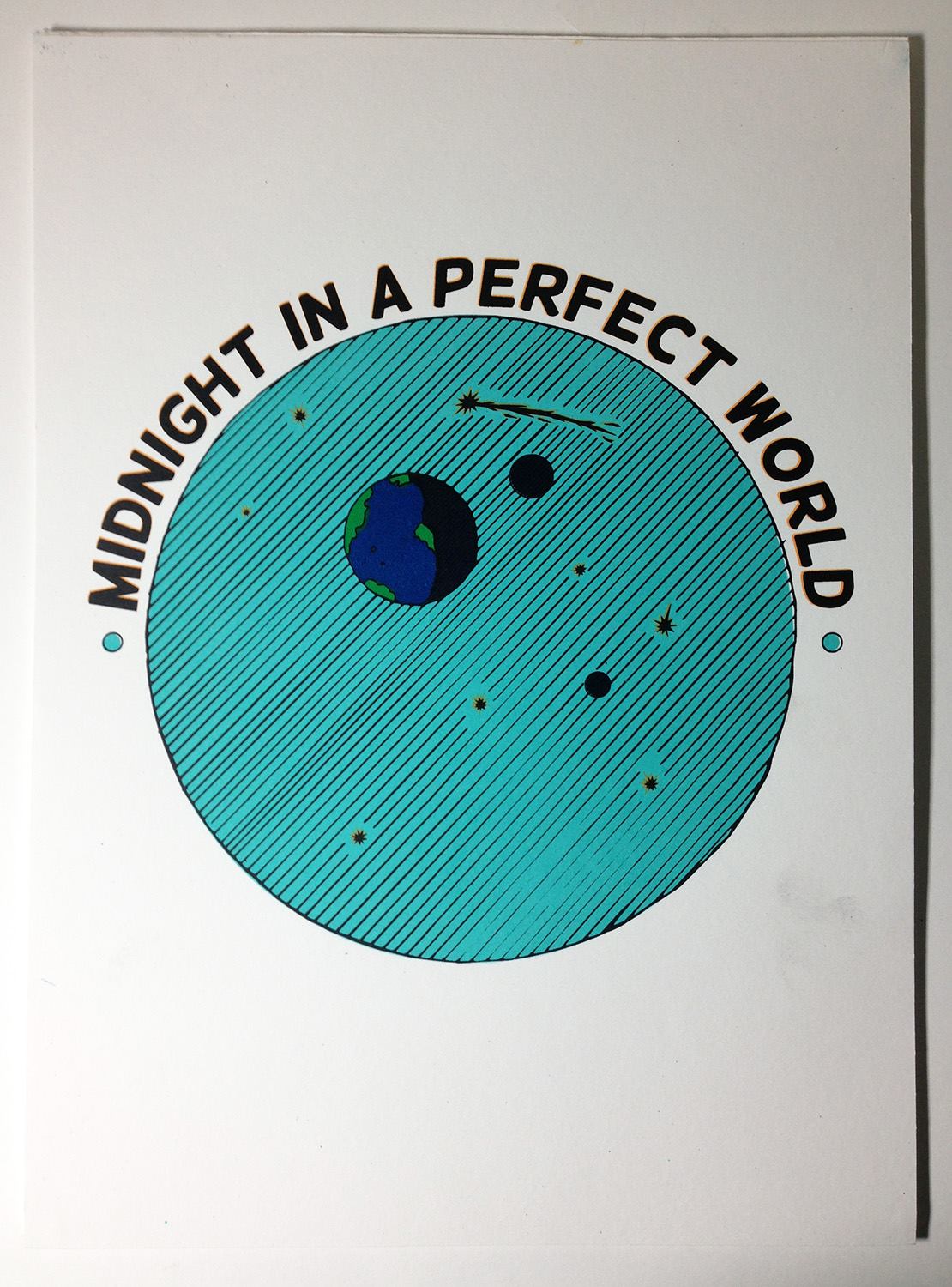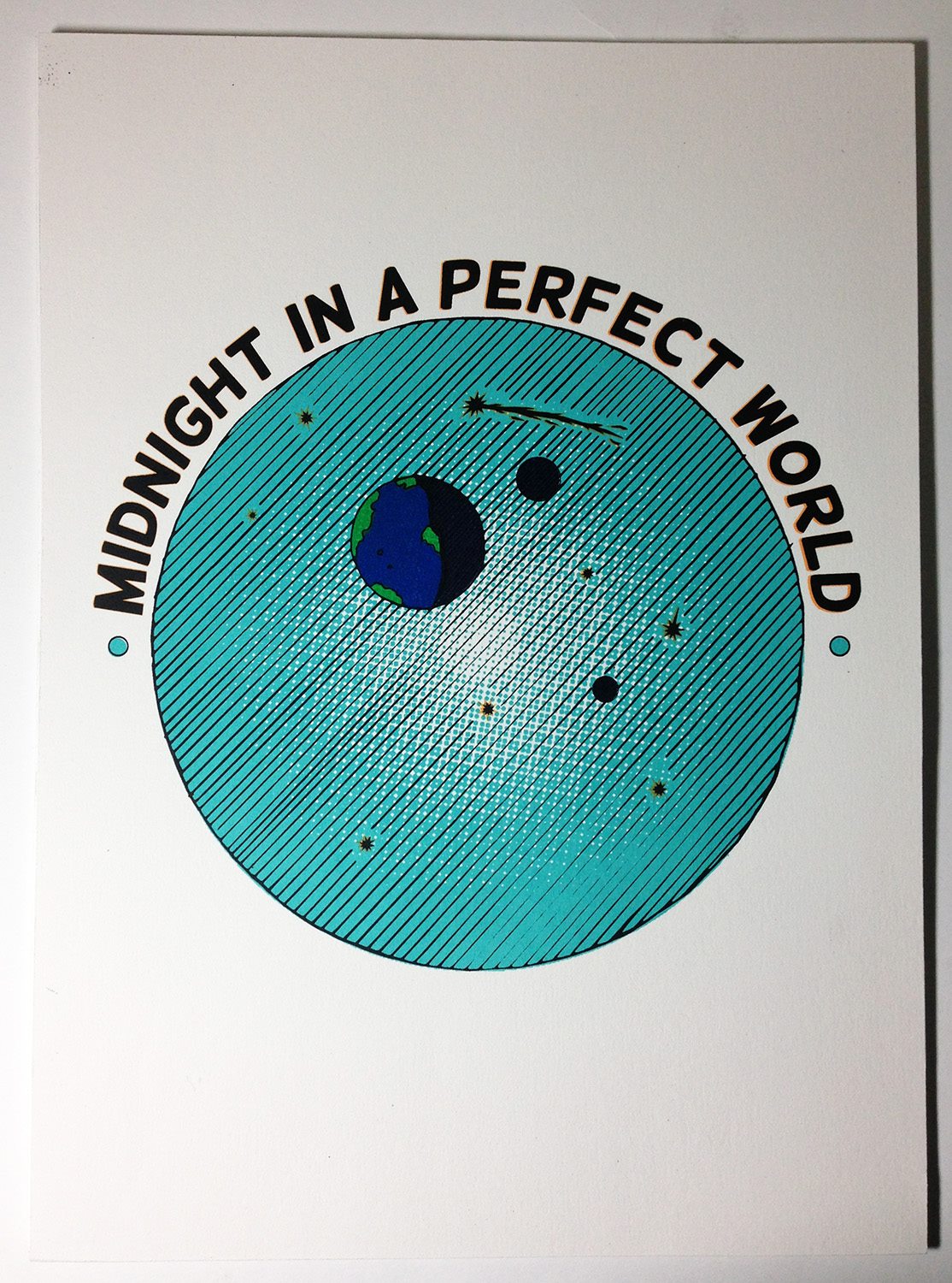This piece was inspired by DJ Shadow’s track, ‘Midnight In a Perfect World‘. I’ve produced several variations of this print, which will be uploaded in due course. A significant challenge faced during its creation was the excessive ink coverage from the orange background, causing the paper to warp and disrupting the registration. To address this, I made adjustments, incorporating a halftone background to minimise ink usage, thereby reducing both warping and paper shrinkage. The endeavour also presented issues related to room temperature and ink drying – invaluable lessons as I establish my home screen printing studio.